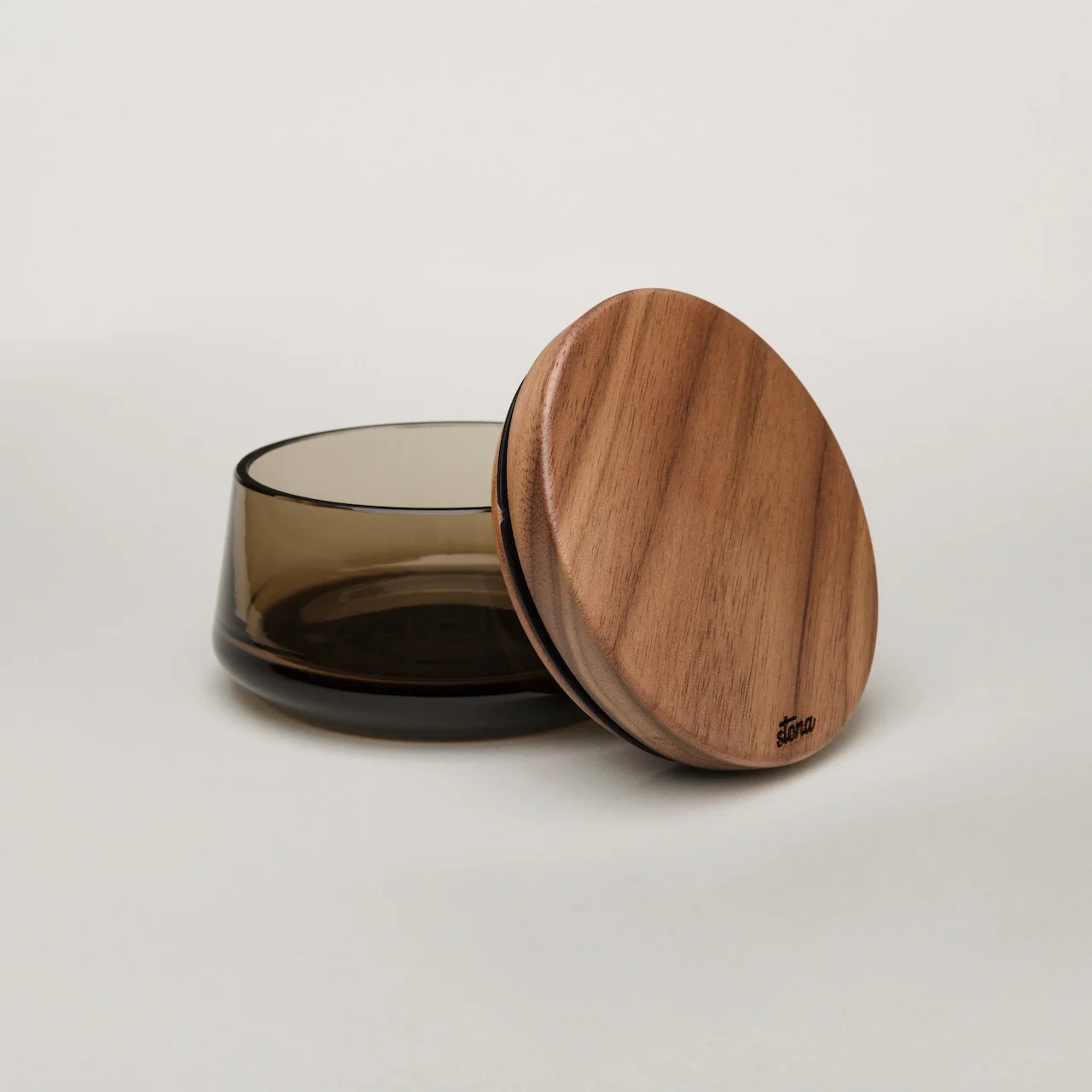 A handcrafted storage jar made from the same glass and wood as your Stona Grinder.